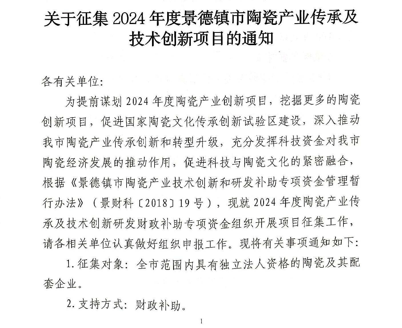 关于征集2024年度景德镇市陶瓷产业传承及技术创新项目的通知
