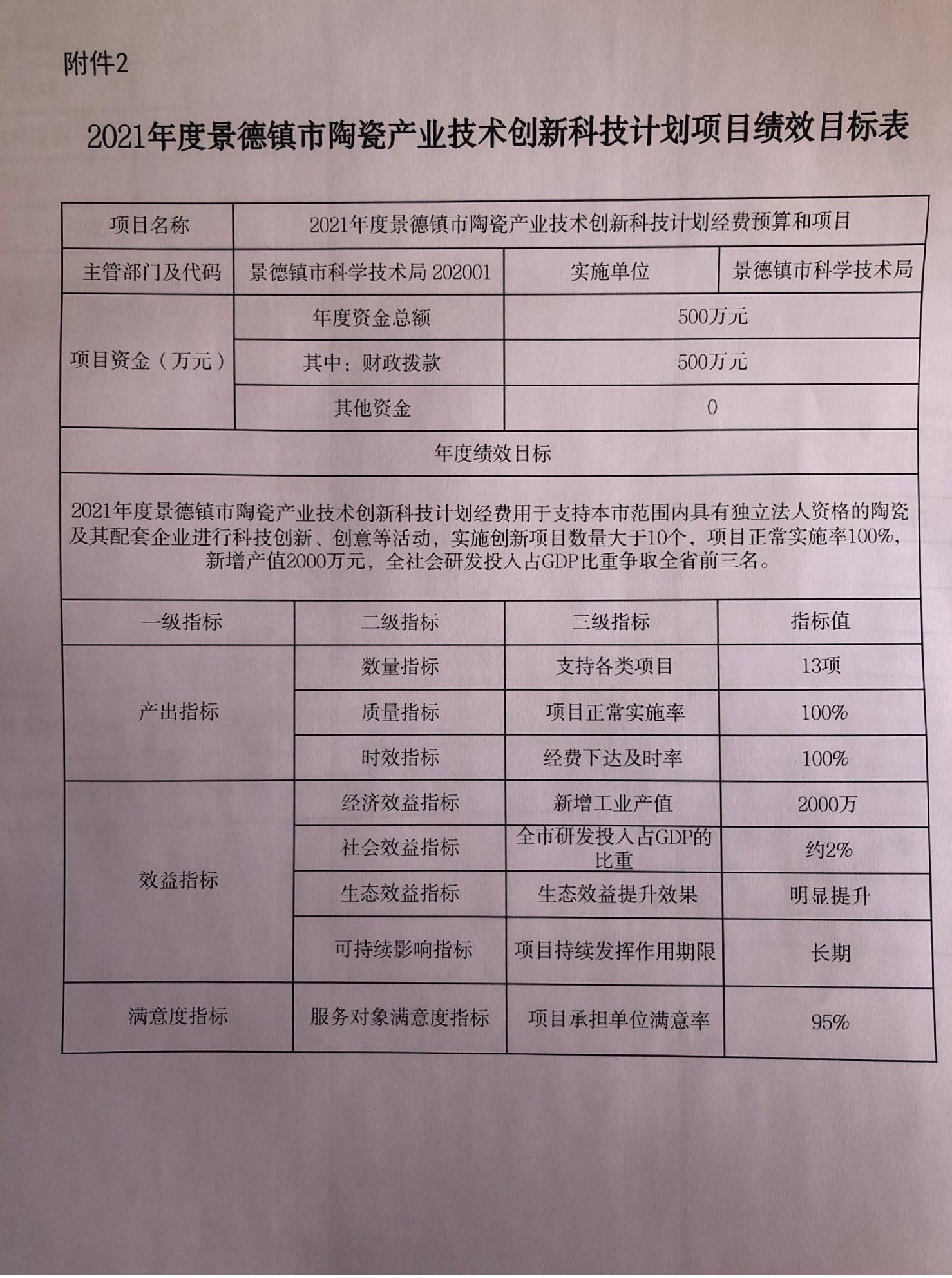 2021年度景德镇市陶瓷产业技术创新科技计划项目绩效目标表