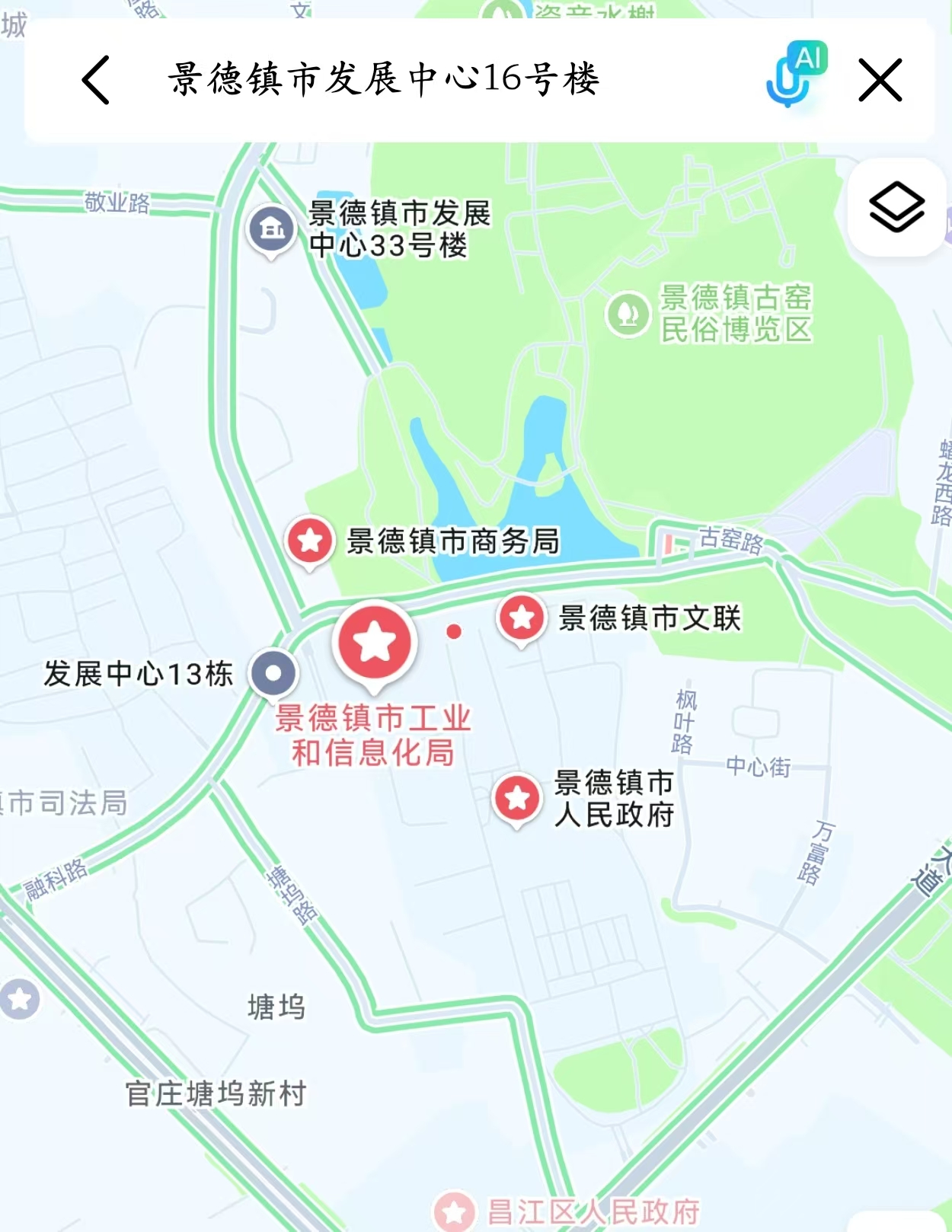 新办公地址导航:请搜索“景德镇市发展中心16号楼”。